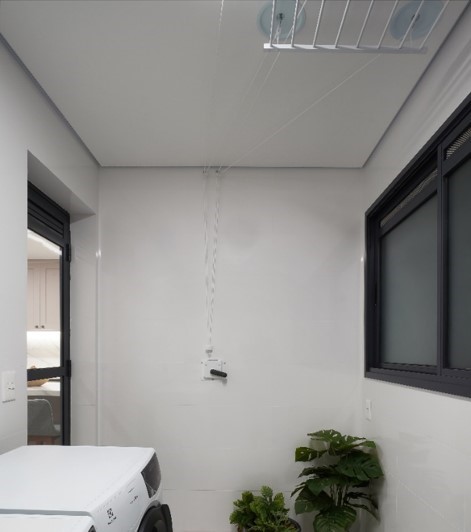 Considerando que o cuidado com as roupas é a principal atribuição do ambiente, Rosangela diz que o improviso precisa passar longe. Para não dispor dos recursos de piso dispostos nos outros espaços da casa (ainda que muitas vezes ele seja complementar), é preciso pensar na melhor possibilidade do varal para a área de serviço. De acordo com ela, os varais retráteis ou de teto são considerados conforme a demanda do morador. “Eu considero se a pessoa tem o hábito de utilizar o recurso de secar dentro da máquina, se prefere a forma mais usual e o volume”, enumera.