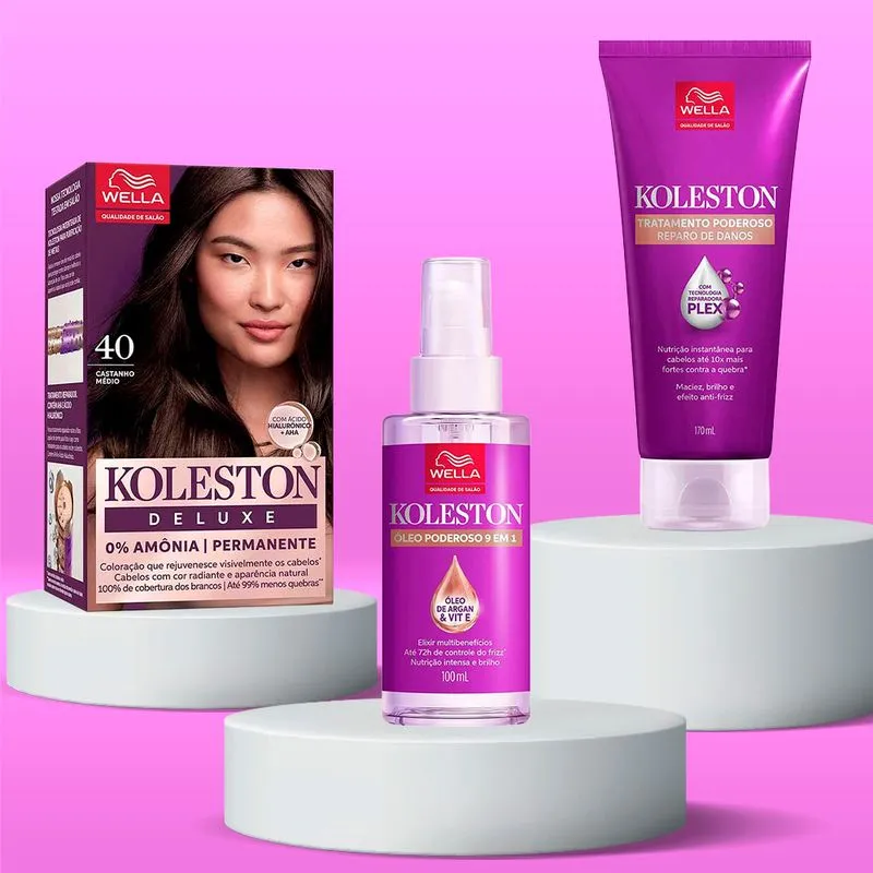 Koleston mantém a intensidade da cor dos cabelos por até dez semanas e oferece cobertura perfeita dos brancos. Com tecnologia avançada, combate danos aos cabelos, hidrata tão intensamente quanto colore. Sua fórmula foi desenvolvida para realçar os 7 sinais de um cabelo saudável: cor vibrante, luminoso, macio, sedoso, forte, hidratado e fácil de pentear. O tratamento restaurador pós-coloração de Koleston conta com a tecnologia Plex, composta por ácido málico, garantindo ainda mais tratamento aos fios, a partir de um reparo tanto por fora quanto por dentro.