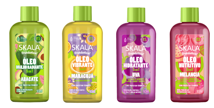Os quatro novos óleos da linha Skala Frutástica são verdadeiros coringa na rotina capilar, com textura leve e multifuncionalidade 5 em 1: Todas as opções foram desenvolvidas para oferecer brilho radiante e sensorial marcante, podendo ser usadas como reparador de pontas, finalizador, em umectações noturnas ou como protetor térmico (230 °C), além da embalagem possuir 90ml.